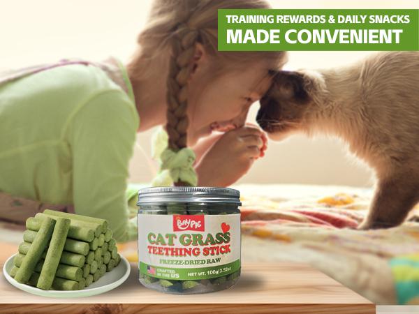 Oral Health & Hairball Control: Our freeze-dried cat chew sticks do more than taste greatβthey help clean teeth, reduce plaque, and freshen breath naturally. Plus, the fiber-rich cat grass reduces hairball, keeping your cat feeling great and improving digestion